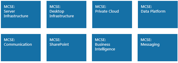 الـ MCSE أو Microsoft Certified Solutions Expert متواجدة معنا أيضا في هذا المقال، للـ MCSE هناك ثماني شهادات مختلفة والتي هي امتداد للشهادات التي رأيناها في الـ MCSA وهي موضحة بالصورة التالية :